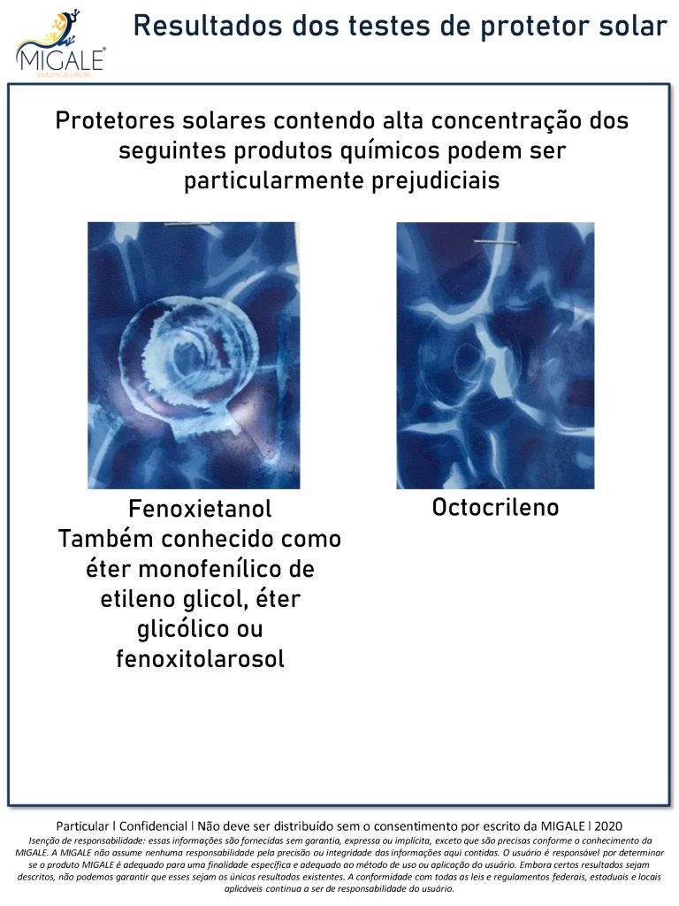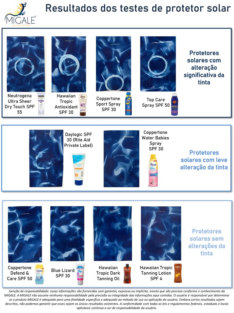 Foram utilizados protetores solares comercializados no mercado Americano, porém podemos utilizar como exemplo para o componente que mais ataca a estampa do material.